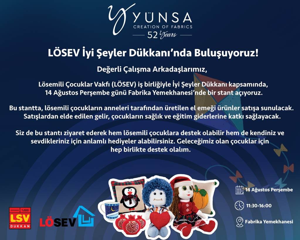 Yünsa olarak, LÖSEV iş birliğiyle üretim tesisimizin yemekhanesinde LÖSEV İyi Şeyler Dükkanı’nı kurduk. Lösemili çocukların anneleri tarafından üretilen el emeği ürünlere Yünsa ailesi olarak destek verdik ve böylece çocukların sağlık ve eğitim giderlerine katkı sağladık. Birlikte iyilik için adım atmaktan mutluluk duyuyoruz.
